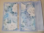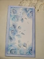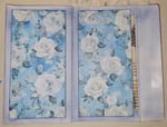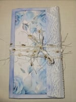 This beautiful Blue Roses booklet will be a new favorite. It was created from envelopes so every spread has ample space to tuck away photos, notes, or small keepsakes. This booklet is the perfect size to slip into your handbag. The Blue Roses booklet is distressed with Faded Jeans Distress Oxide and lovingly embellished with lace and rhinestones, and closes with white & gold eyelash trim.